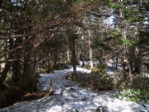 写真の残雪のエリア辺りからチェーンスパイクを装着しましたが、気温が高く天気が良すぎたため踏み抜きが多く、何十回踏み抜いたか覚えていません。